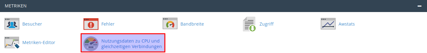 In Ihrem Kontrollpanel können Sie den Ressourcenverbrauch Ihres Hosting Accounts prüfen. Verwenden Sie dazu die Funktion "Nutzungsdaten zu CPU und gleichzeitigen Verbindungen" unter dem Abschnitt "Metriken".