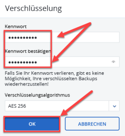 Wählen Sie ein Passwort für die Backupverschlüsselung und klicken Sie auf "OK". Wichtig! Falls Sie Ihr Kennwort verlieren, können Sie die Daten nicht mehr wiederherstellen!