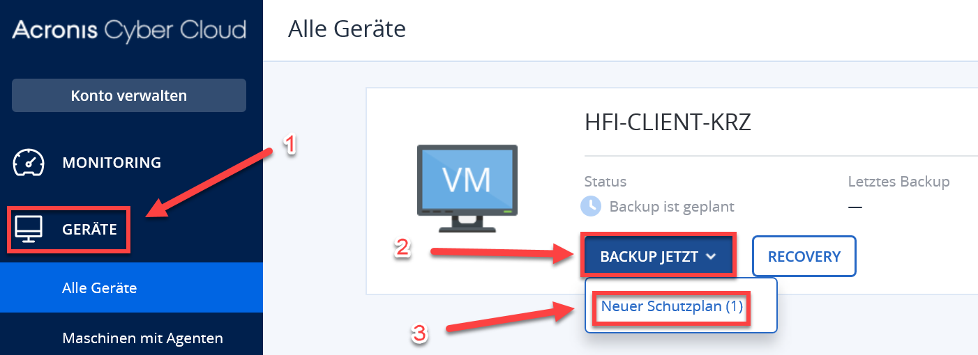 Sie können nun entweder warten, bis ein Backup automatisch vorgenommen wird, oder Sie können ein Backup manuell starten. Klicken Sie hierfür auf der linken Seite auf "Geräte" und anschliessend auf "BACKUP JETZT" --> "Neuer Schutzplan".