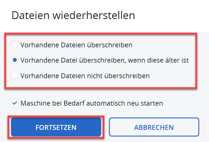 Vor der Wiederherstellung können Sie bestimmen, was mit der vorhandenen Datei passieren soll, falls eine bereits existierende Datei wiederhergestellt werden sollte. Klicken Sie auf "Fortsetzen" um mit der Wiederherstellung zu beginnen.