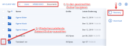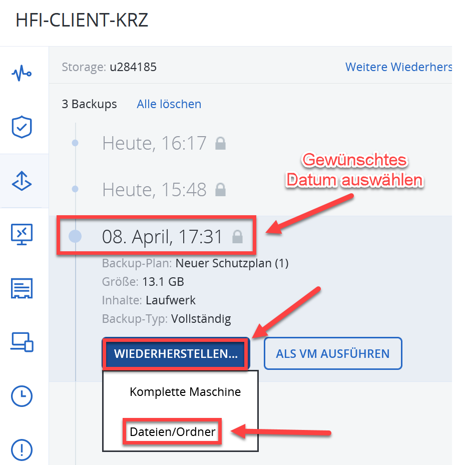 Wählen Sie das gewünschte Datum aus, klicken Sie auf "Wiederherstellen" und dann auf "Dateien/Ordner".